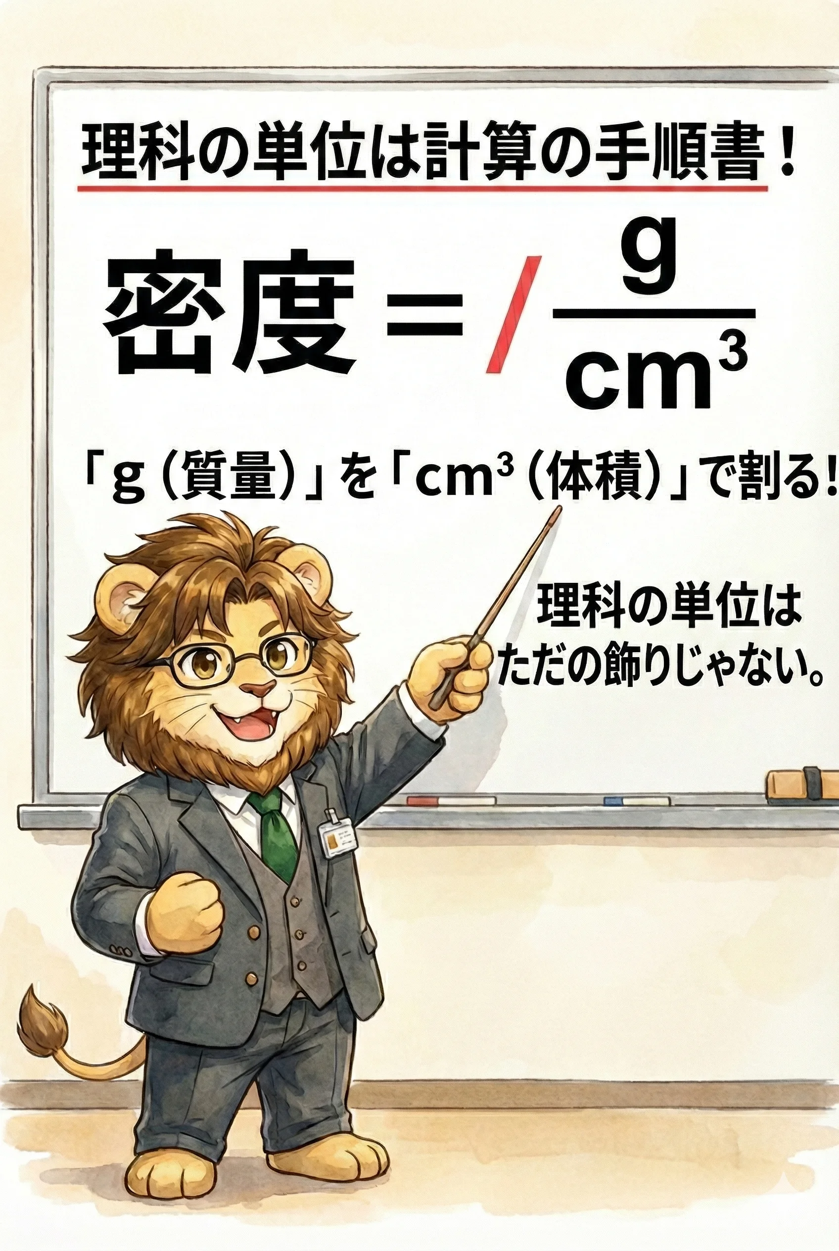 📐「この斜めの線(スラッシュ)は割り算のマークだ。つまり、この単位は『g(質量)を cm3(体積)で割りなさい』と命令しているんだよ!これが分かっている子は、割り算の順番を迷わない」