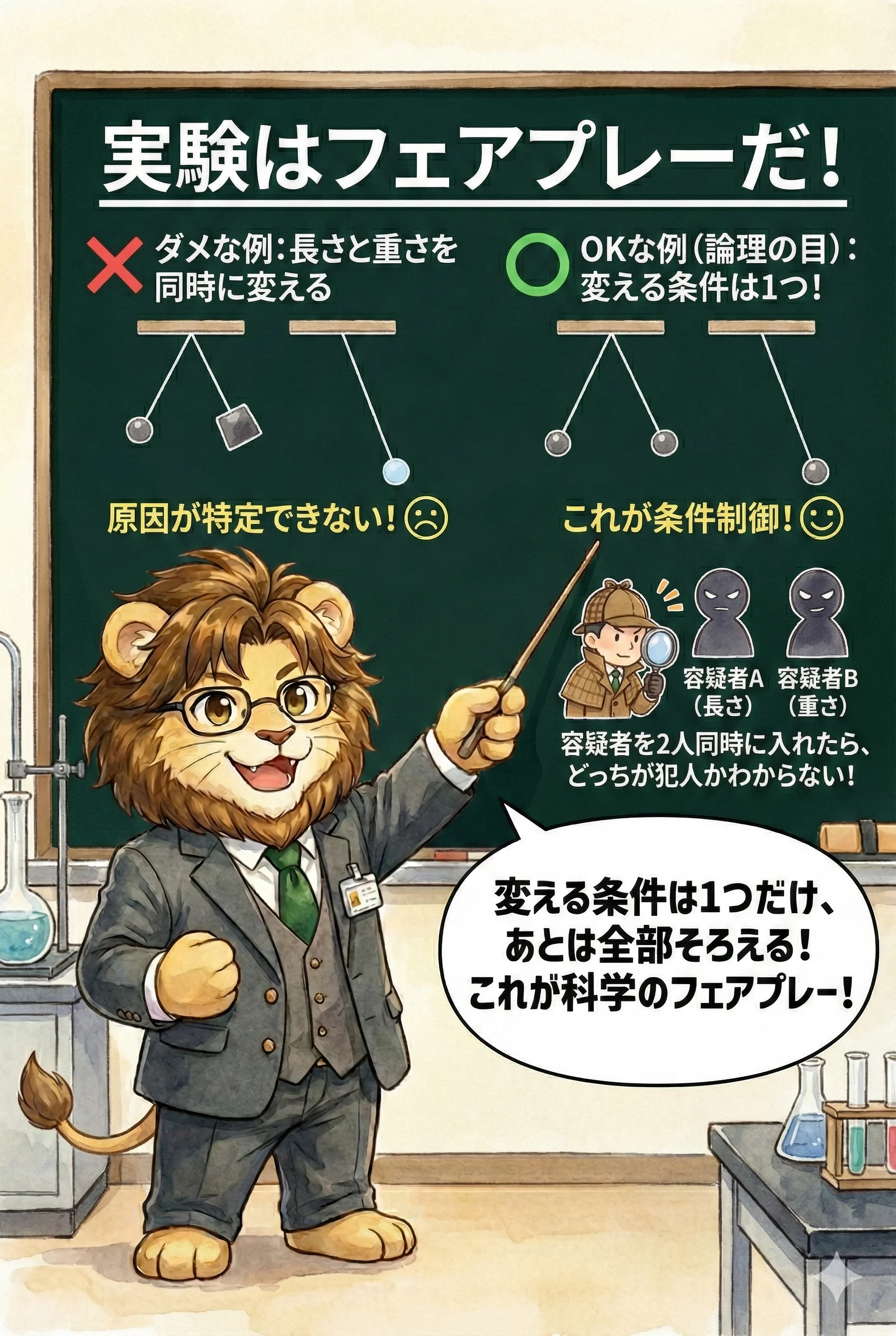 🕵「変える条件は1つだけ。あとは全部そろえる。 これが科学の鉄則だ!」