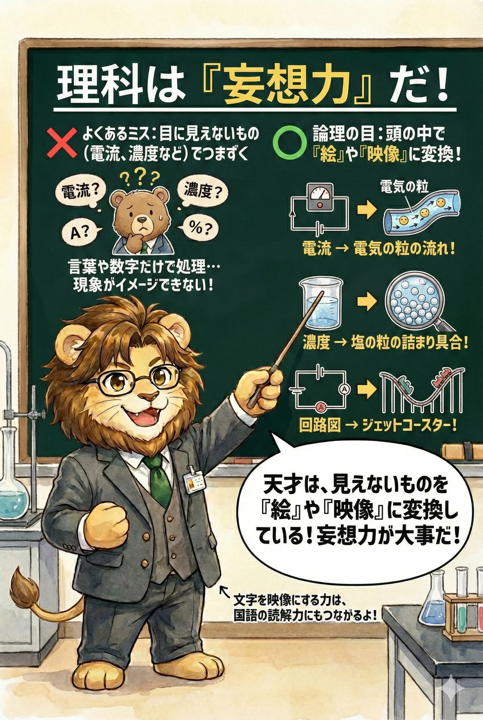 ライ先生の授業では、回路図をジェットコースターに見立てたり、濃度を粒の混み具合で考えたりと、とにかくイメージ(映像)を大切にします。 文字や数字を、頭の中で「絵」に変換する力。