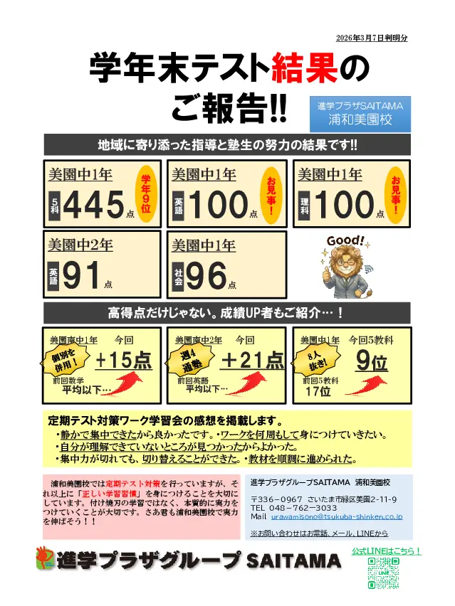 【2025年度学年末テスト結果】5教科445点や100点満点が続出!浦和美園校の定期テスト対策で、15点UPなど成績向上者が急増中です。点数アップの秘訣をブログで公開。