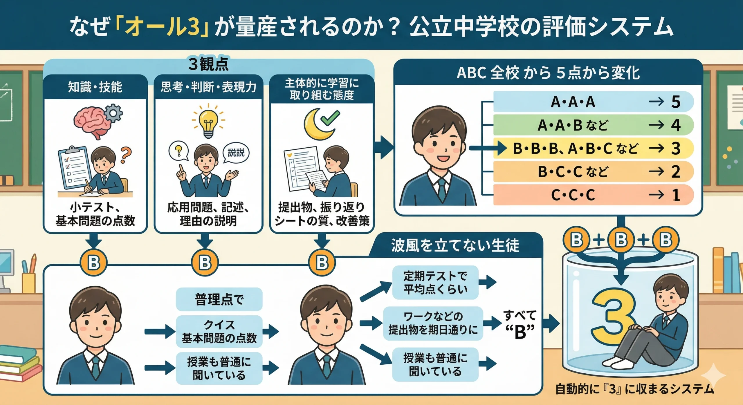 「普通にやってるのに3止まり」には理由があります。オール3から抜け出せない本当の原因と、成績を一段上げるための具体的な勉強法を公開。