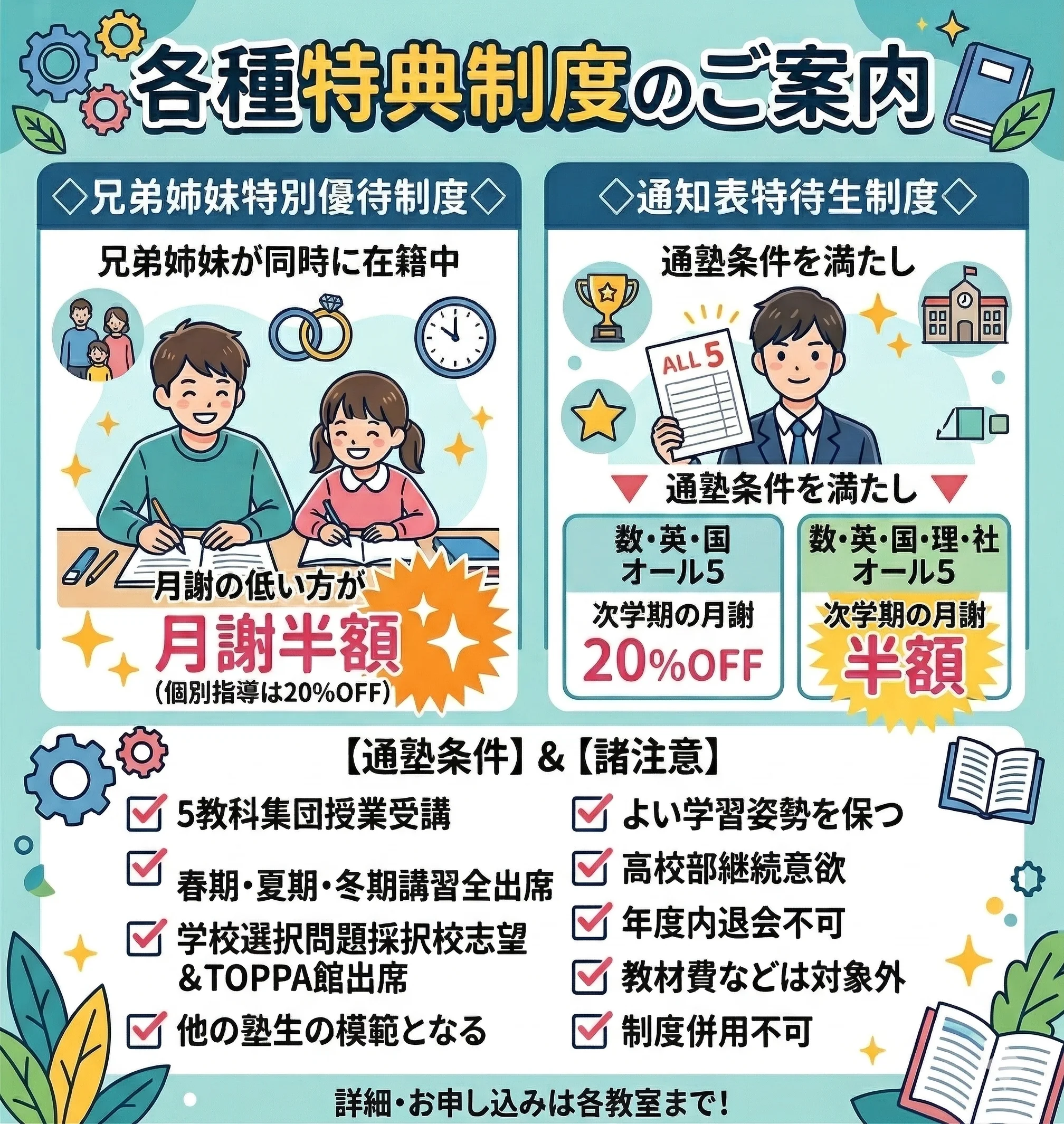 ※各特典制度の併用はできません。また、季節講習費や教材費等は対象外となります。詳細な条件につきましては、教室までお問い合わせください。