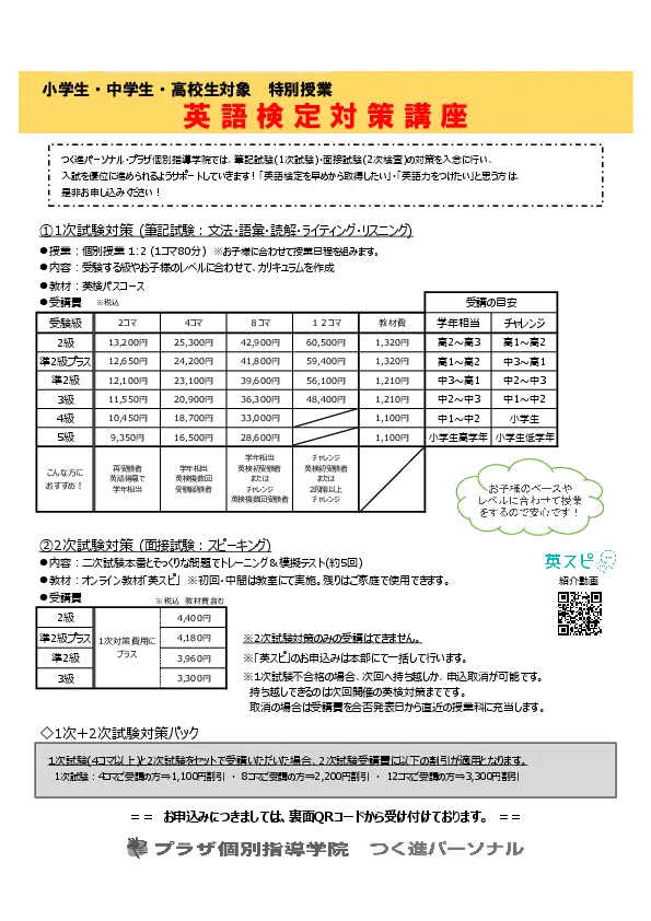 二次対策は「英スピ」のシステムを使用し、二次試験本番とそっくりな問題でトレーニング&模擬テスト(約5回)、初回・中間は教室にて実施。残りはご家庭で使用できます。