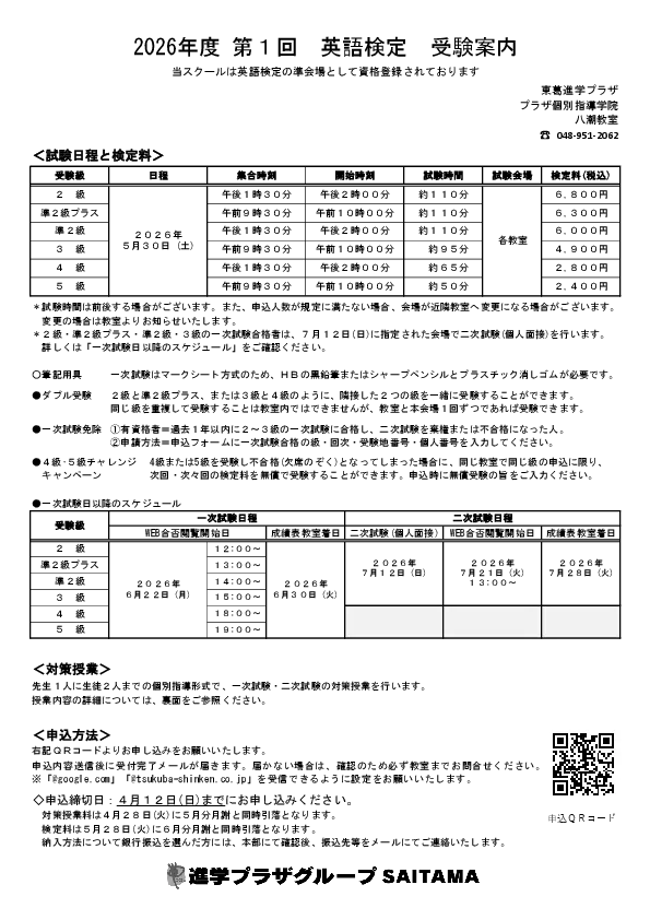 当塾は英検の準会場として資格登録されており、八潮教室で一次試験の受験が可能です。
